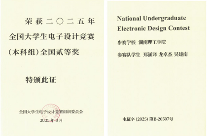 笃实励新,知行并进。大一阶段,他进入学校实验室学习专业知识,同时不落下基础课程的钻研。他深知大学学习需要主动、超前,大一结束时,便已学完大二部分专业课,并将所学知识运用到实际中。大一暑假,他参加湖南省电子设计竞赛,凭借扎实的专业基础和出色的实践能力,取得省级二等奖的优异成绩。